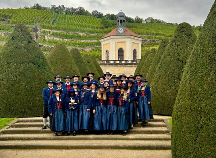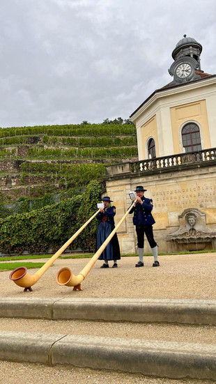 Am Samstag stand der Vormittag zur freien Verfügung, ehe es um 12 Uhr in die entgegengesetzte Richtung ging - nach Radebeul zum Staatsweingut „Schloss Wackerbarth“. Hier durften wir bei schöner Kulisse die Besucher drei Stunden lang mit Blasmusik und Alphornklängen unterhalten. Wir mussten alle sehr Lachen, als nach der kurzen Ansprache durch unsere Michaela, wer wir sind und wo wir her kommen, lautes Jubelgeschrei aus dem Schlossgarten kam - die Kameraden waren letztens erst noch in unserem örtlichen Sportfachgeschäft beim einkaufen. Wie klein doch die Welt ist!